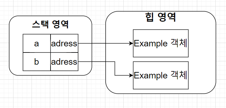 Example 타입의 클래스 변수 a, b에 Example 객체를 생성하는 것이다