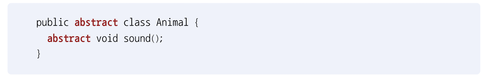 그렇다고 해서 sound() 메소드를 실체 클래스에서 작성하도록 하면 sound() 메소드를 잊어버리고 작성하지 않을 경우 동물은 소리를 낸다는 것에 위배된다.