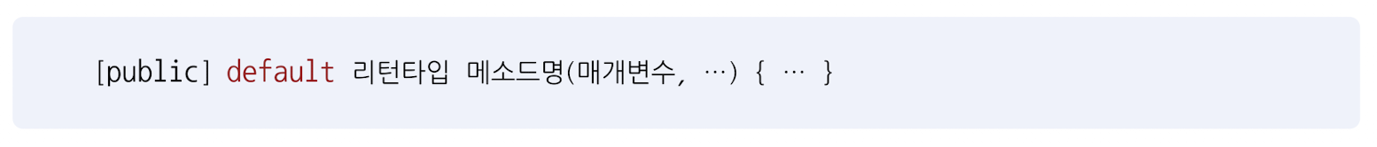 선언 방법은 클래스 메서드와 동일한데, 차이점은 default 키워드가 리턴 타입 앞에 붙는다.