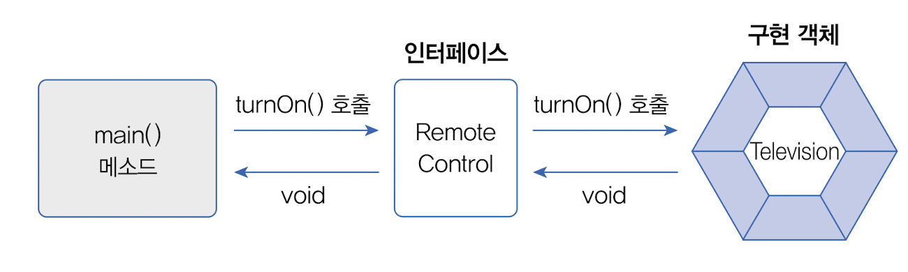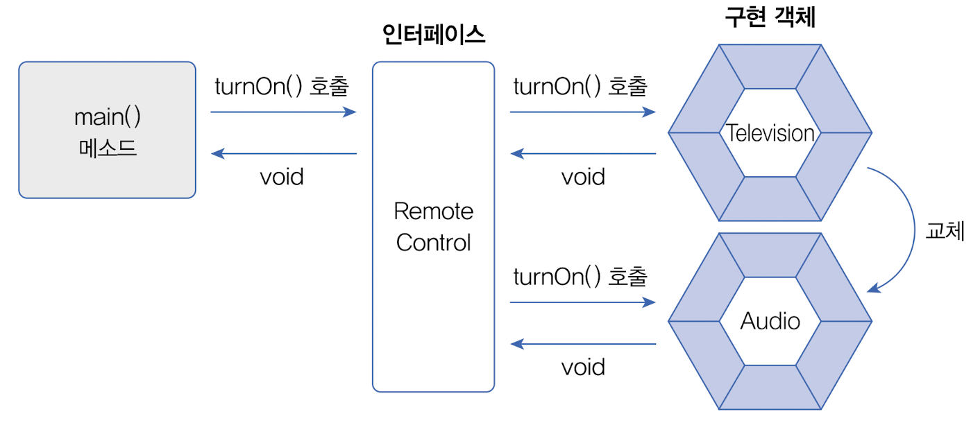 인터페이스는 개발 코드와 객체가 서로 통신하는 접점 역할을 한다. 개발 코드가 인터페이스의 메소드를 호출하면 인터페이스는 객체의 메소드를 호출시킨다. 그렇기 때문에 개발 코드는 객체의 내부 구조를 알 필요가 없고 인터페이스의 메소드만 알고 있으면 된다.