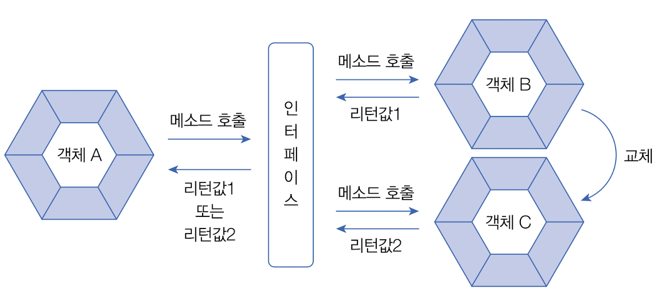 개발 코드가 인터페이스 메소드를 호출하면 인터페이스는 객체의 메소드를 호출한다.