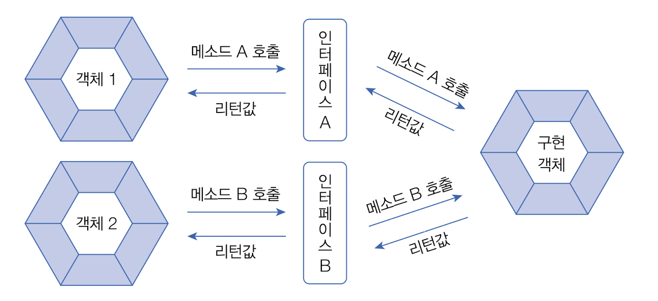 구현 객체가 인터페이스 A와 인터페이스 B를 구현하고 있다면, 각각의 인터페이스를 통해 구현 객체를 사용할 수 있다.