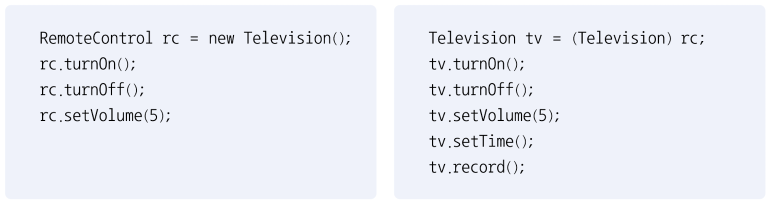 RemoteControl 인터페이스에는 3개의 메서드, Television 클래스에는 5개의 메서드가 선언되어 있다면 RemoteControl 인터페이스로 호출 가능한 메서드는 3개뿐이다.