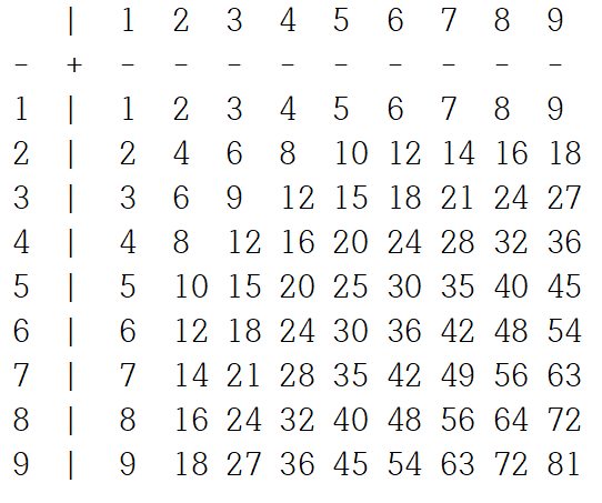위와 같이 |, -, + 를 사용하여 위쪽과 왼쪽에 곱하는 수가 있는 곱셈표를 출력하는 프로그램을 작성