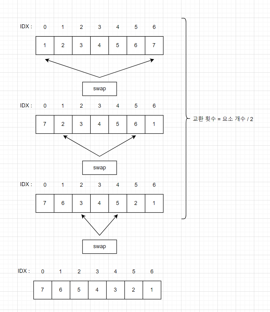 배열의 요소가 1, 2, 3, 4, 5, 6, 7 이렇게 7개 있다고 하면 역순으로 정렬하면 7, 6, 5, 4, 3, 2, 1이다.