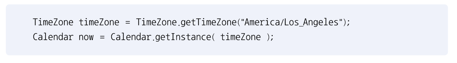 아래의 코드는 로스엔젤레스의 TimeZone 객체의 ID를 getInstance() 메소드의 매개값으로 넘겨주는 예제이다.