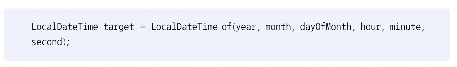 비교를 위해 특정 날짜와 시간으로 LocalDateTime 객체를 얻는 방법은 아래와 같다.