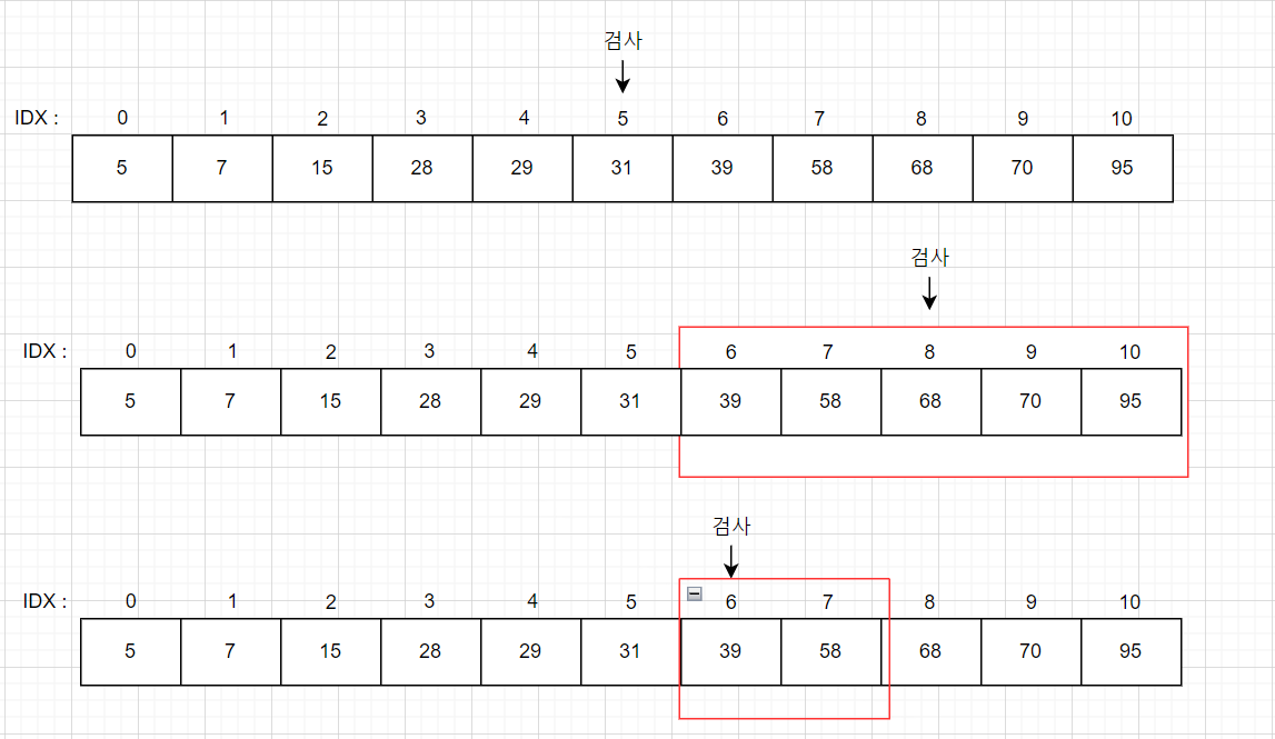 인덱스 5의 값은 31은 39보다 작으므로 검색 대상을 뒤쪽 5개로 좁힐 수 있다.