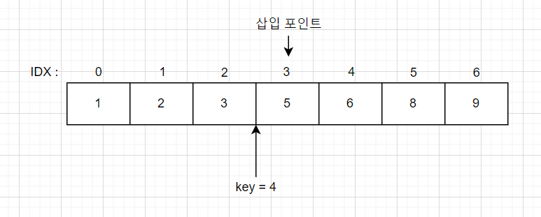 삽입 포인트는 검색하기 위해 지정한 key보다 큰 요소 중 첫 번째 요소의 인덱스이다. 만약 배열의 모든 요소가 key보다 작다면 배열의 길이를 삽입 포인트로 정한다.