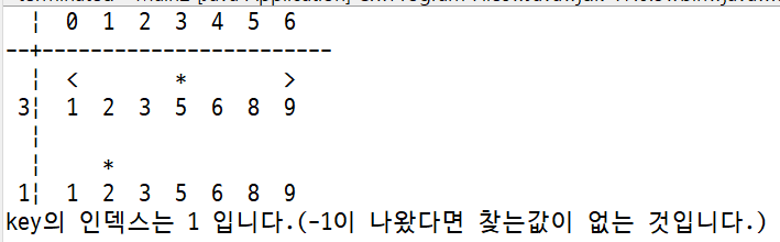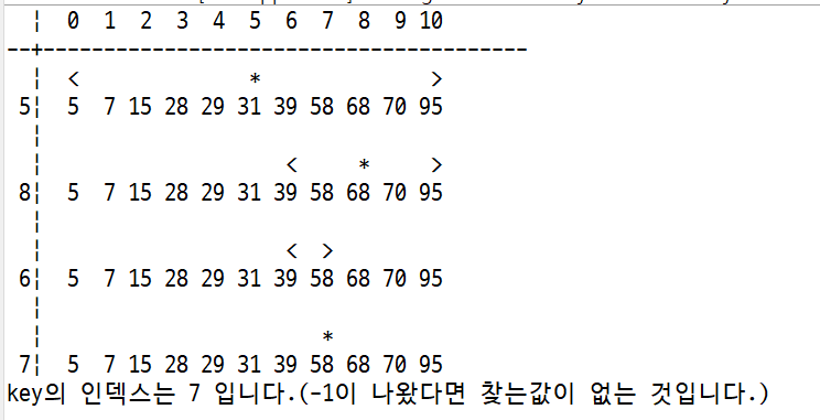 (단, 각 행의 맨 왼쪽에 현재 검색하고 있는 요소의 인덱스를 출력하고, 검색범위의 맨 앞 요소 위에 <, 맨 끝 요소 위에 >, 현재 검색하고 있는 중앙 요소 위에 *를 출력)