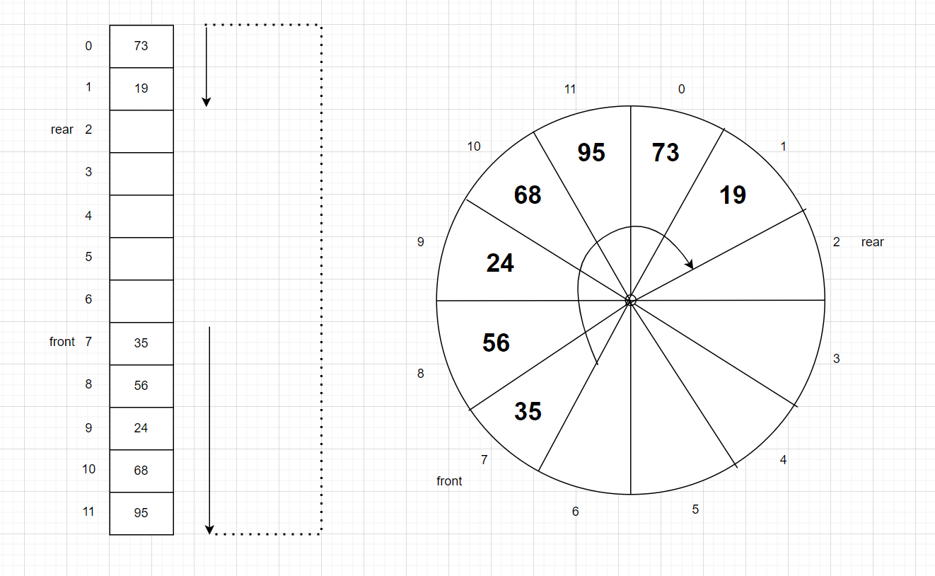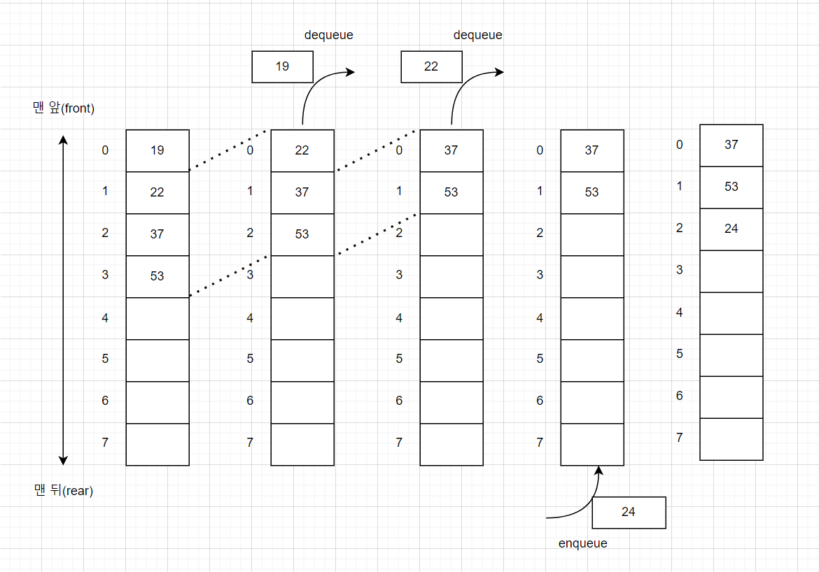 - front와 rear는 논리적인 데이터 순서를 말한다. 배열의 물리적 요소의 순서가 아니다.