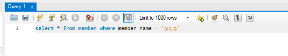 where에 member_name이 아이유인 사람만 추출해 달라는 코드이다.