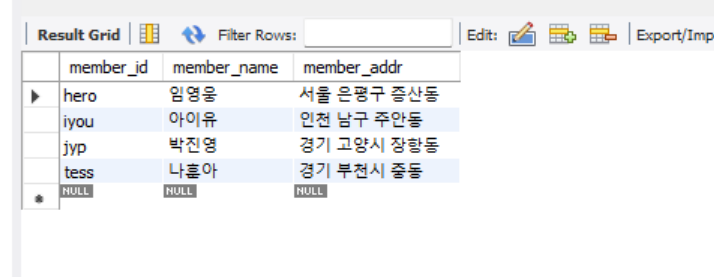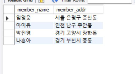 member 테이블에서 이름과 주소만 출력하려면 아래와 같이 입력하면 된다.