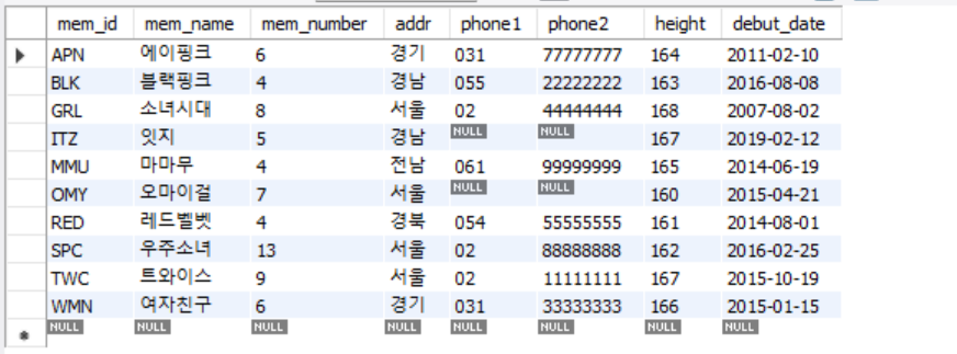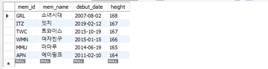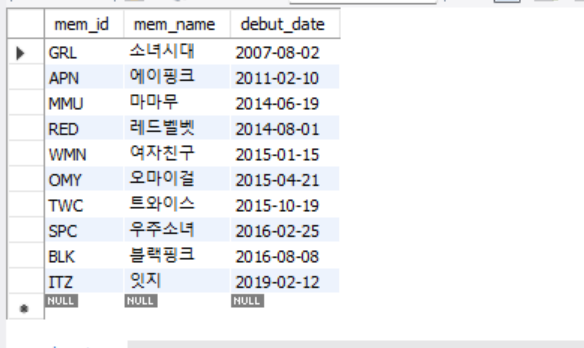 member 테이블에서 데뷔일자가 빠른 순서대로 출력하려면 아래처럼 작성한다.