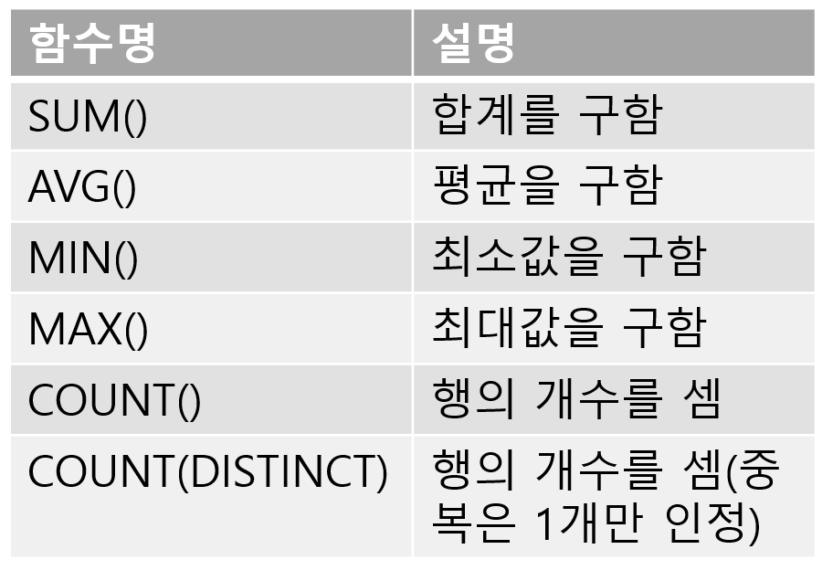 위와 같이 그룹별로 합계나 평균 최소값등을 구하고 싶을 때는 집계 함수를 사용한다.