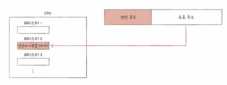 하지만 여기서 오퍼랜드 필드 안에 메모리 주소가 담긴다면 표현할 수 있는 데이터의 크기는 하나의 메모리 주소에 저장할 수 있는 공간만큼 커진다.