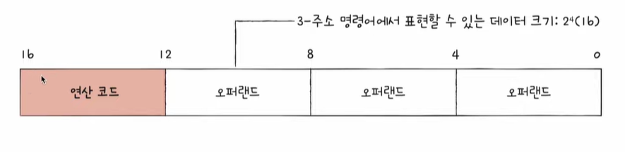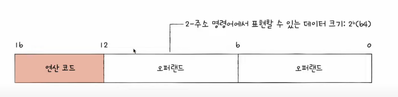 그 이유는 가령 명령어의 크기가 16비트, 연산 코드 필드가 4비트인 2-주소 명령어에서는 오퍼랜드 필드당 6비트 정도밖에 남지 않는다.