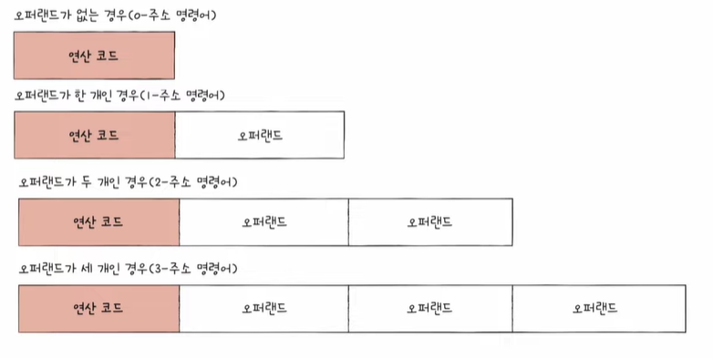 오퍼랜드가 하나도 없는 명령어를 0-주소 명령어, 오퍼랜드가 하나인 명령어를 1-주소 명령어, 두 개인 명령어를 2-주소 명령어, 세 개인 명령어를 3-주소 명령어라고 부른다.