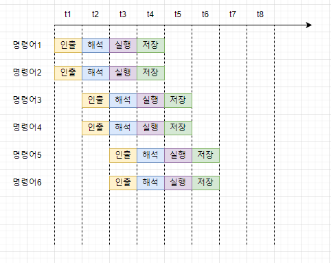 이처럼 공장 생산 라인과 같이 명령어들을 명령어 파이프라인에 넣고 동시에 처리하는 기법을 명령어 파이프라이닝이라고 한다.