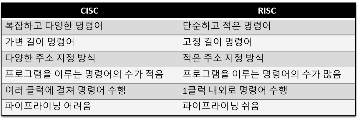 RISC는 CISC보다 명령어의 종류가 적고, 규격화된 명령어, 되도록 1클럭 내외로 실행되는 명령어를 지향한다.