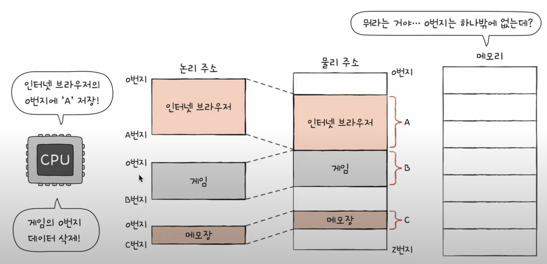 만약 현재 메모리에 메모장, 게임, 웹 브라우저가 적재되어 있다고 가정하면 이러한 프로그램들은 다른 프로그램들이 메모리 몇 번지에 저장되어 있는지(물리주소) 굳이 알 필요가 없다.