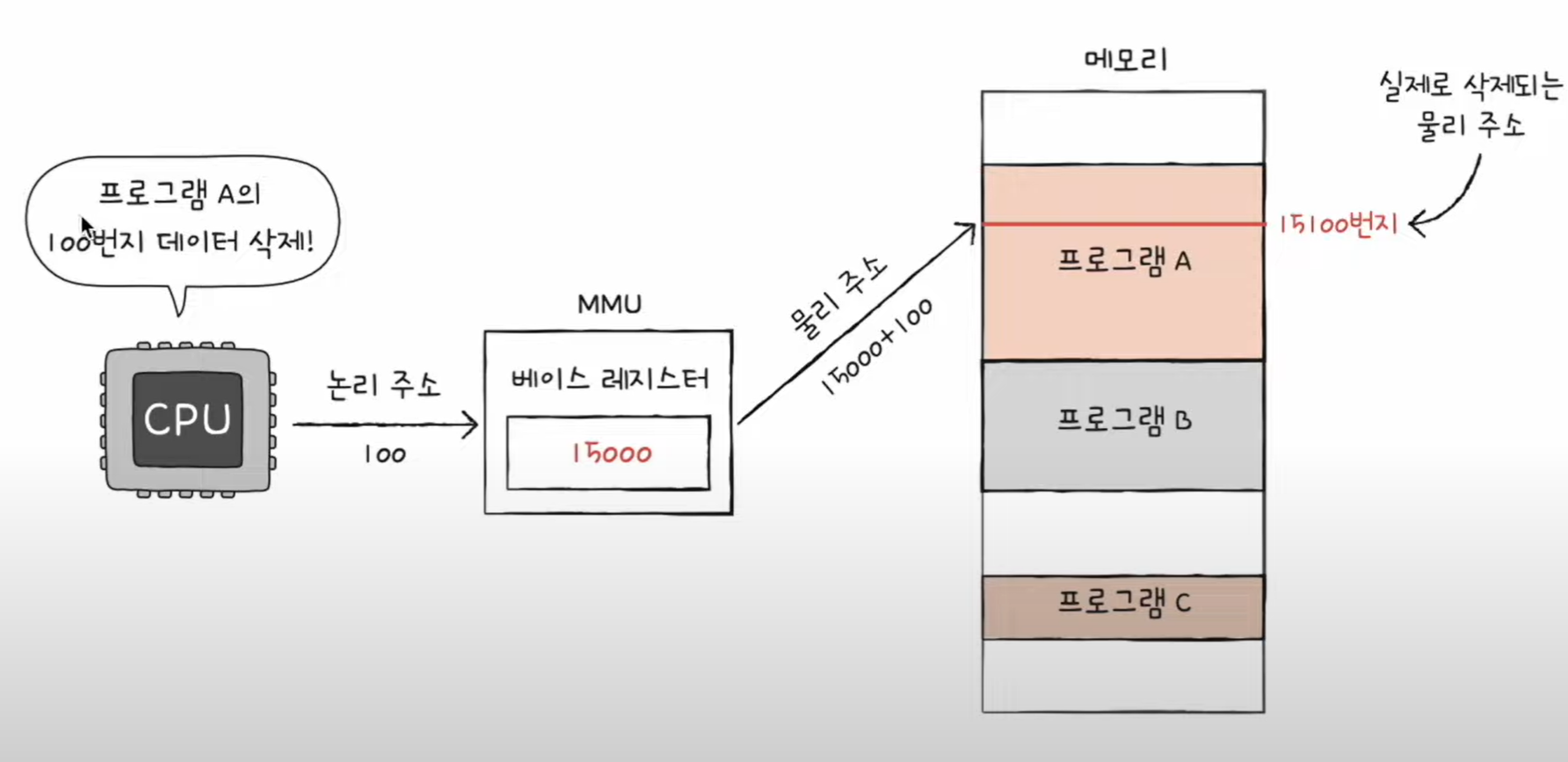 MMU는 CPU가 발생 시킨 논리 주소에 베이스 레지스터 값을 더해 논리 주소를 물리 주소로 변환한다.