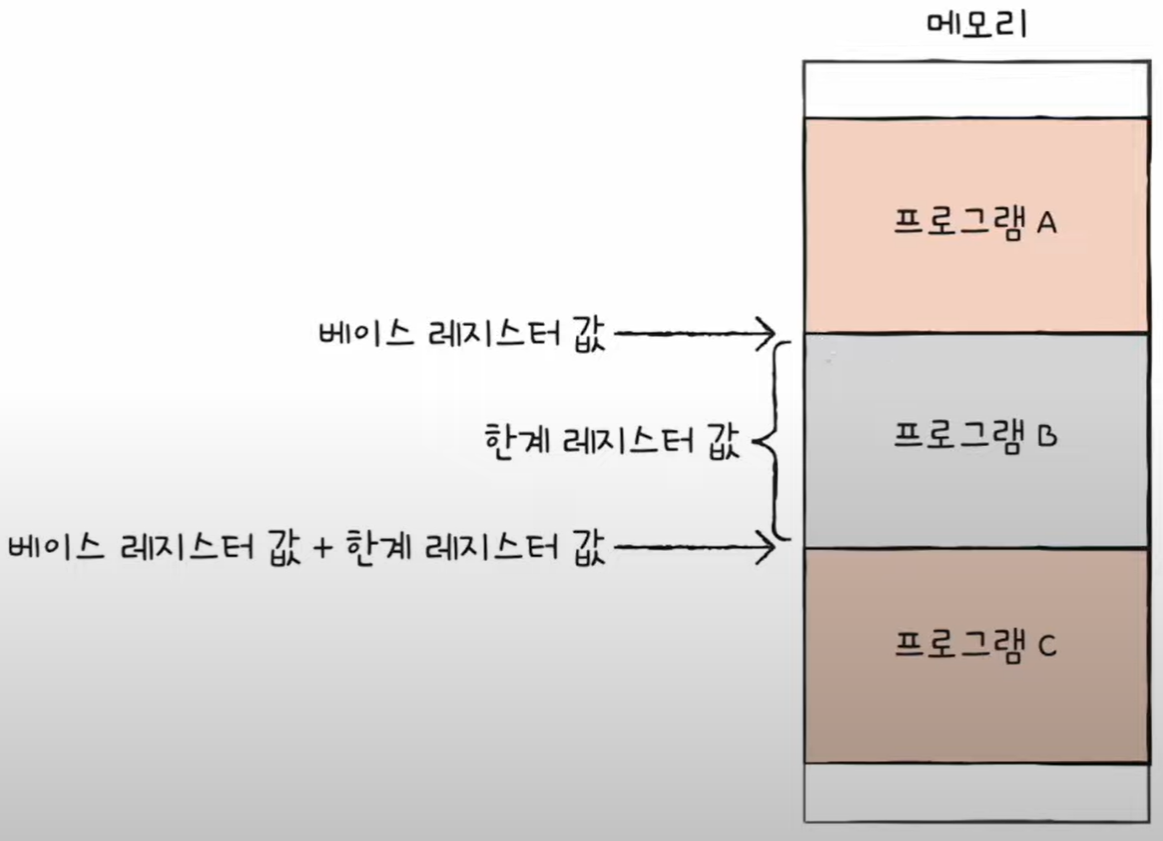- 베이스 레지스터 값 <= 프로그램의 물리 주소 범위 < 베이스 레지스터 + 한계 레지스터 값