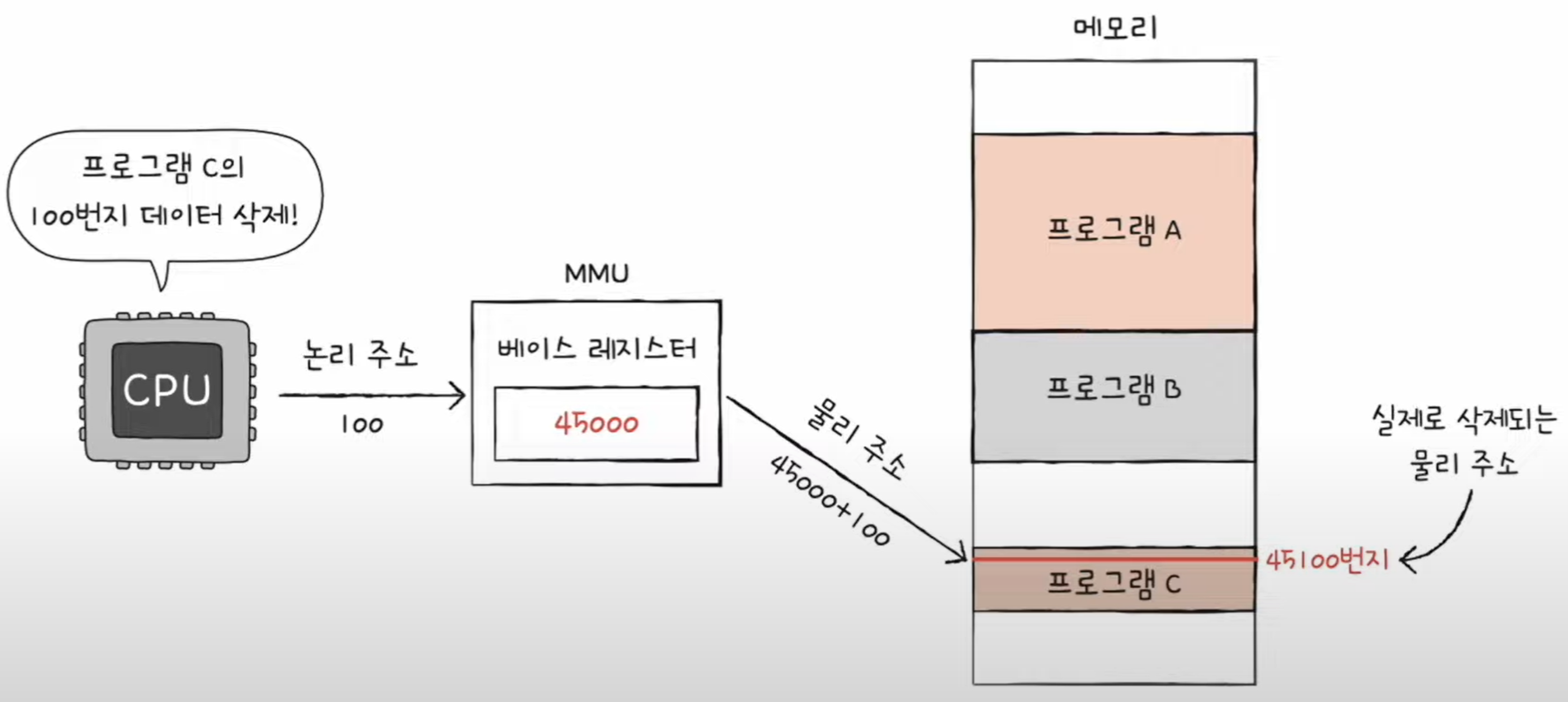 만약 베이스 레지스터에 45000이 저장되어 있고 CPU가 발생시킨 논리 주소가 100번지라면 이 논리 주소는 물리 주소 45100(45000+100)번지로 변환된다.