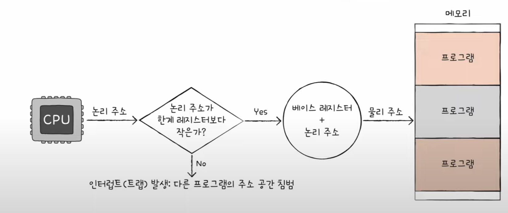 - 베이스 레지스터가 실행 중인 프로그램의 가장 작은 물리 주소를 저장한다면, 한계 레지스터는 논리 주소의 최대 크기를 저장