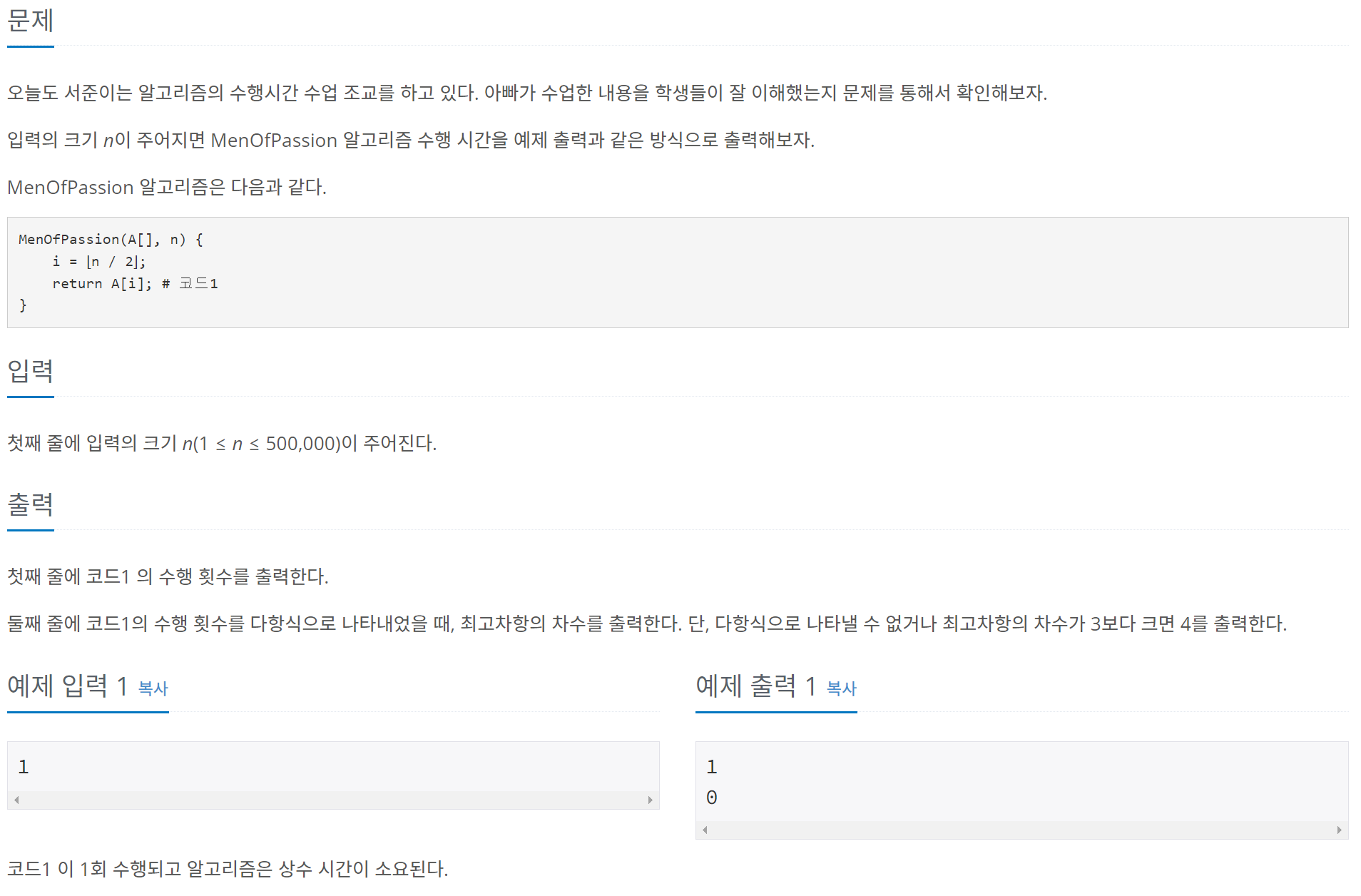 - 따라서 코드 수행 횟수는 1이고, 최고차항의 차수는 0이다.