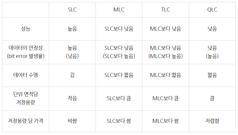 하지만 반대로 SLC로 갈 수록 속도와 데이터의 안정성, 데이터의 수명이 좋아진다.
