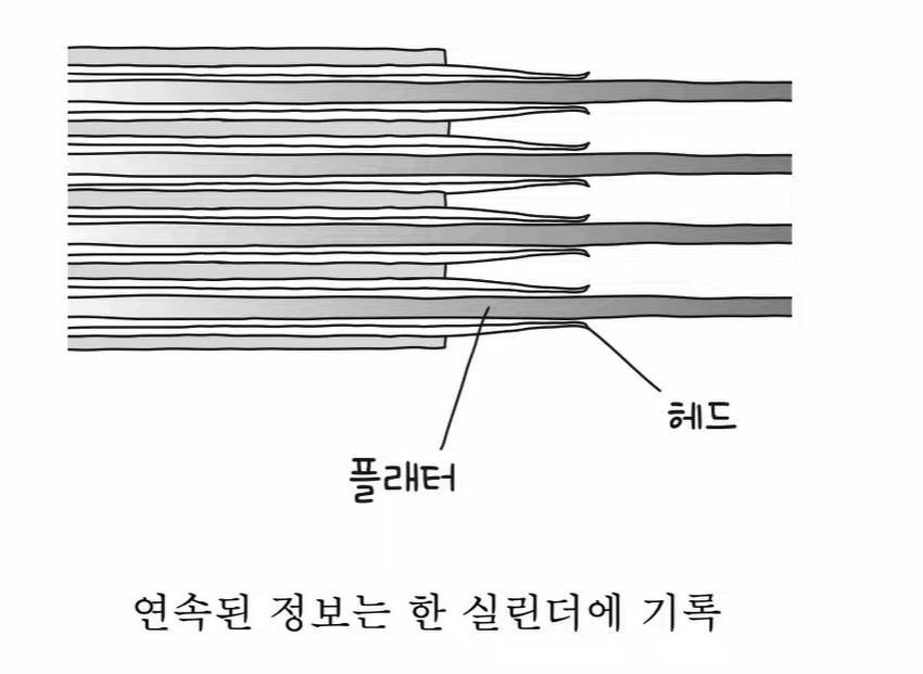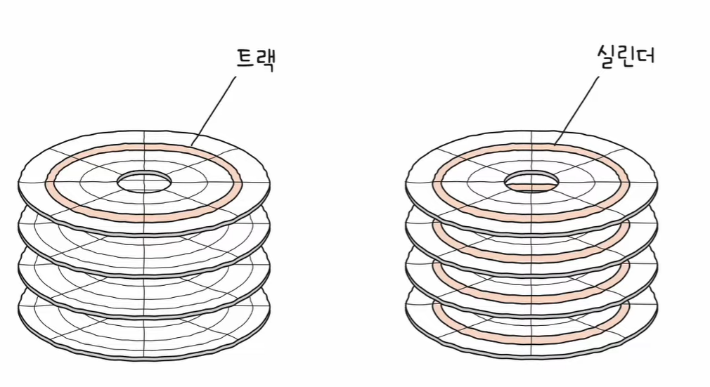 - 실린더 : 여러 겹의 플래터 상에서 같은 트랙이 위치한 곳을 모아 연결한 논리적 단위