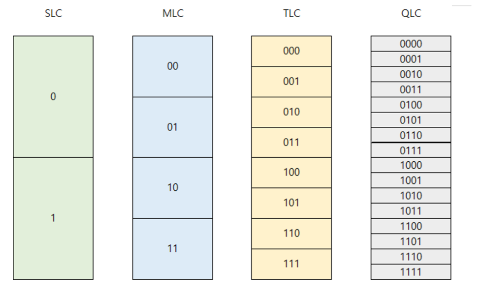 위 그림에서 알 수 있듯 같은 셀 대비 SLC -> MLC -> TLC -> QLC로 갈 경우 더 많은 데이터를 저장할 수 있다.