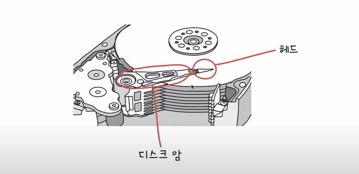 - 디스크 암 : 헤드를 원하는 위치로 이동시키는 장치