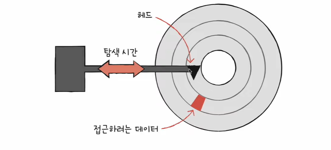 - 탐색 시간(seek time) : 접근하려는 데이터가 저장된 트랙까지 헤드를 이동시키는 시간