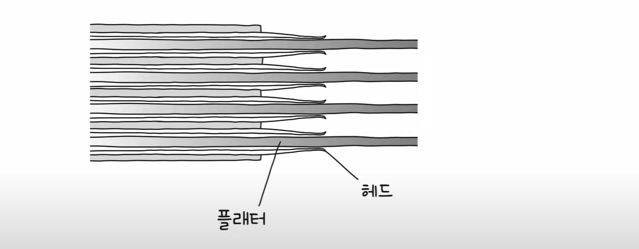 - 헤드 : 플래터를 대상으로 데이터를 읽고 쓰는 구성요소, 플래터 위에서 미세하기 떠 있는채로 데이터를 읽고 쓴다.