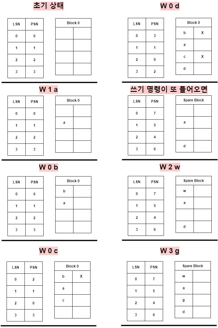 왼쪽의 LSN과 PSN은 논리주소와 물리주소를 뜻한다.(매핑 테이블)