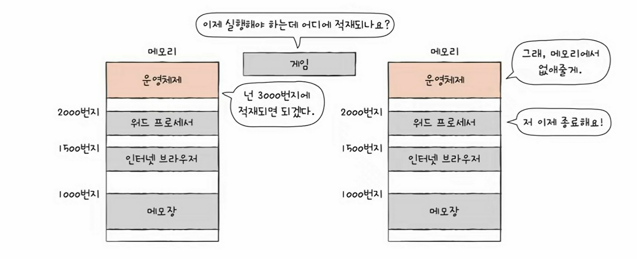 메모리에 적재된 프로세스들은 크기도, 적재되는 주소도 가지각색이다. 같은 프로세스라고 할지라도 실행할 때마다 적재되는 주소는 달라진다. 그래서 운영체제는 새로운 프로세스가 적재될 때마다 어느 주소에 적재해야 할지를 결정한다.