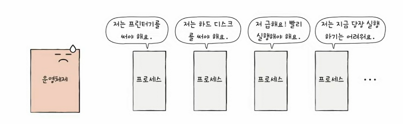 이때 각 프로세스는 상태, 사용하고자 하는 자원 등이 다양하다