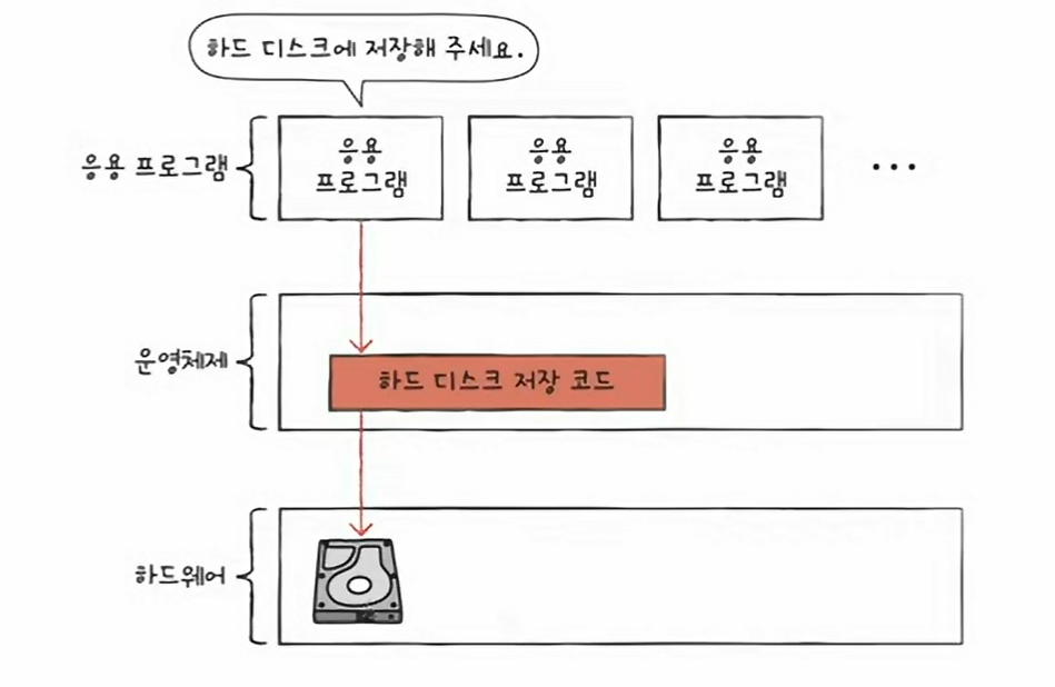 예를 들어 응용 프로그램이 실행 과정에서 하드 디스크에 접근하여 데이터를 저장하려면 운영체제에 도움을 요청해야 하고 , 운영체제는 커널 영역 내의 하드 디스크에 데이터를 저장하는 코드를 실행하여 응용 프로그램의 작업을 대신 수행한다.