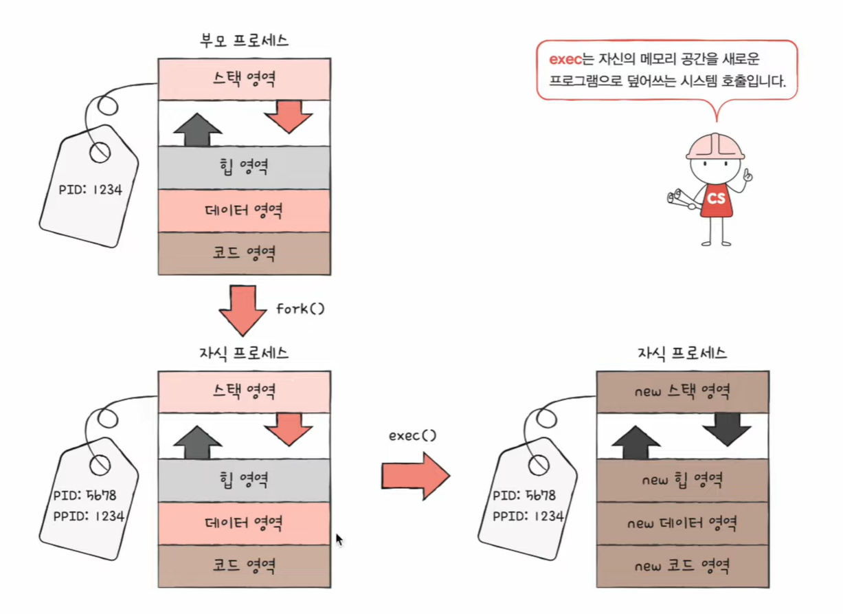 - exec(옷 갈아입기)시스템 호출 : 자식 프로세스는 자신의 메모리 공간을 다른 프로그램으로 교체