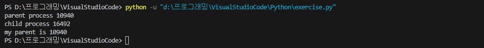 부모 프로세스의 PID는 10940이고, 자식 프로세스의 PID는 16492라고 출력된다.