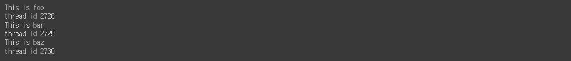 위 코드는 스레드1은 foo(), 스레드 2는 bar(), 스레드 3은 baz()함수를 호출한다.