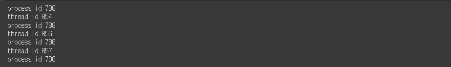 하지만 프로세스 ID는 각 스레드가 다르므로 모두 다르다.