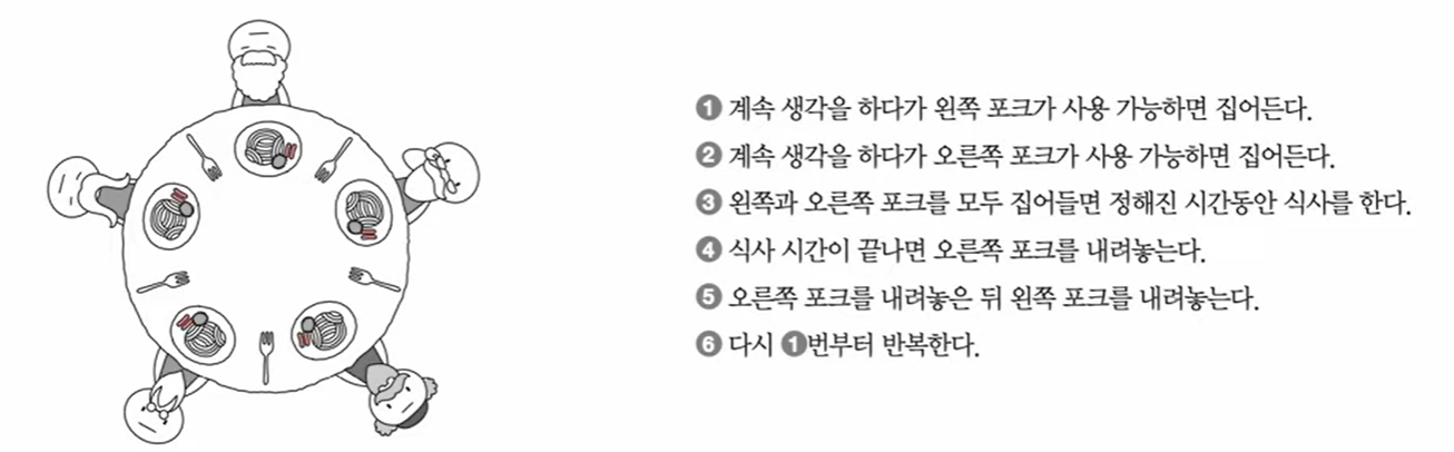 식사하는 철학자 문제에서 한두 명의 철학자가 식사를 할 때는 문제가 되지 않지만, 모든 철학자가 동시에 포크를 집어 식사를 하면 어떤 철학자도 식사를 할 수 없다.(교착 상태)