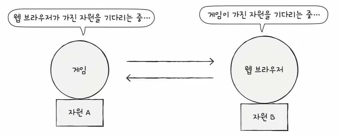 - 게임 프로세스는 자원 A를 점유한 채 웹 브라우저 프로세스가 점유하고 있는 자원 B의 사용을 기다림