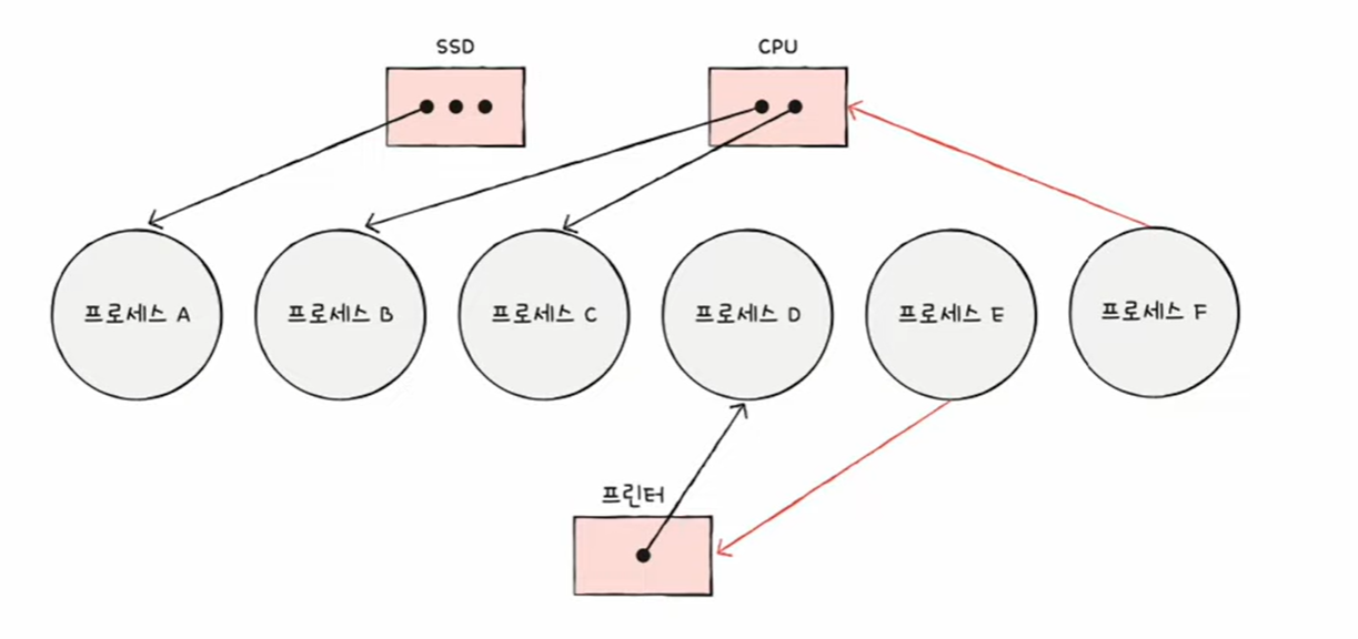 - 프로세스 A는 SSD를 할당받아 사용 중, 프로세스 B와 C는 CPU를 할당받아 사용 중, 프로세스 D는 프린터를 사용 중