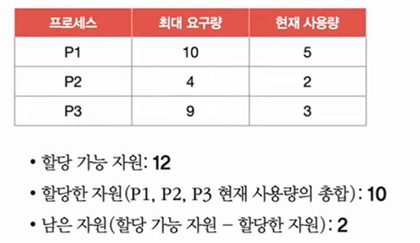 - 이미 자원을 5개 점유하고 있던 P1은 남은 자원에서 5개를 추가적으로 할당받고 싶지만, 남은 자원이 4개이므로 작업을 완료할 수 없게 된다.