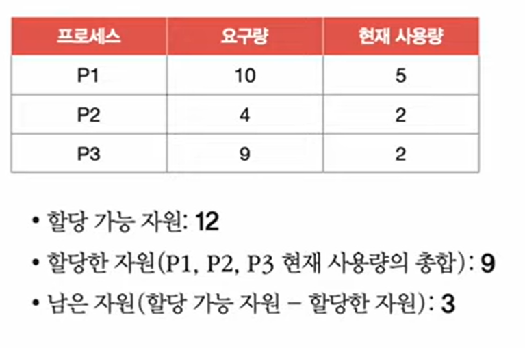 - 이미 자원을 3개 점유하고 있던 P3은 남은 자원에서 6개를 추가적으로 할당받고 싶지만, 남은 자원이 4개이므로 작업을 완료할 수 없게 된다.