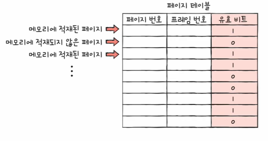 - 유효 비트가 0 : 페이지가 메모리에 적재되어 있지 않음